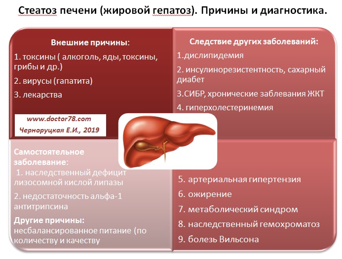 Причины замещения здоровых клеток печени на жировые указаны в таблице.